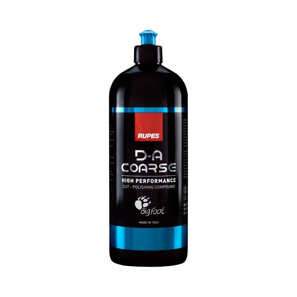 Rupes BigFoot D-A Coarse High Performance Cut Polishing Compound is the latest high performance compound from Rupes designed for maximum efficiency. This fast cutting compound is ideal for users who want quick defect removal and smooth user experience on every type of paint. The formulation is optimized to achieve the best performance if used with Rupes Coarse blue foam, DA wool pads, or coarse microfiber discs together with BigFoot Dual Action Polishers, including both random orbital and gear-driven tools. D-A Coarse represents a significant advancement in the world of cutting compound performance and finishes with excellent clarity, low dusting, and easy wipe off.