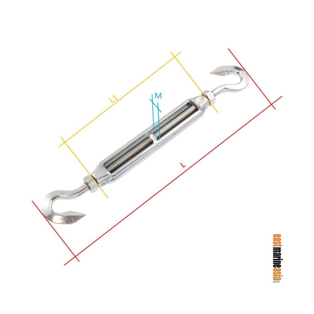 Hamma Industrial S311H is a stainless steel 316 hook-hook turnbuckle with a nut. This item is typically used in shade structures, wire balustrade, architectural rigging, wire rope, marine applications and general-purpose applications.